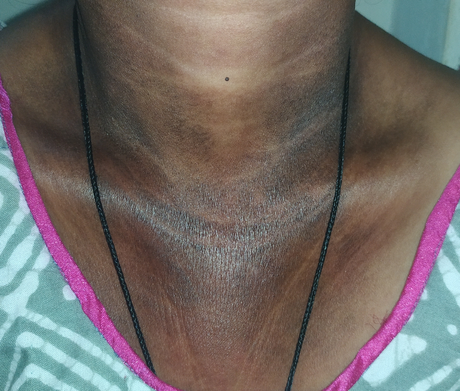 •Around the same time she developed itching over neck and upper chest area.The area was initially red and turned black due to itching.